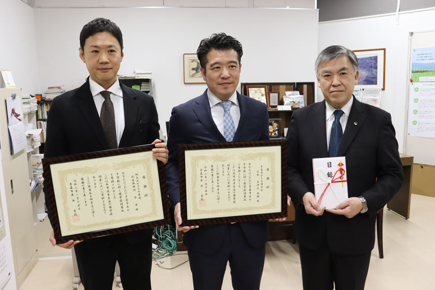寄贈式は、令和8年1月15日(木)に青森市教育委員会にて執り行われました。当社からは取締役管理本部長 櫻井英男が出席し、青森市PTA連合会 会長 木津谷春樹様、そして青森市教育委員会教育長 工藤裕司様へ、感染症対策品として大木製薬ウイルオフを贈呈いたしました。